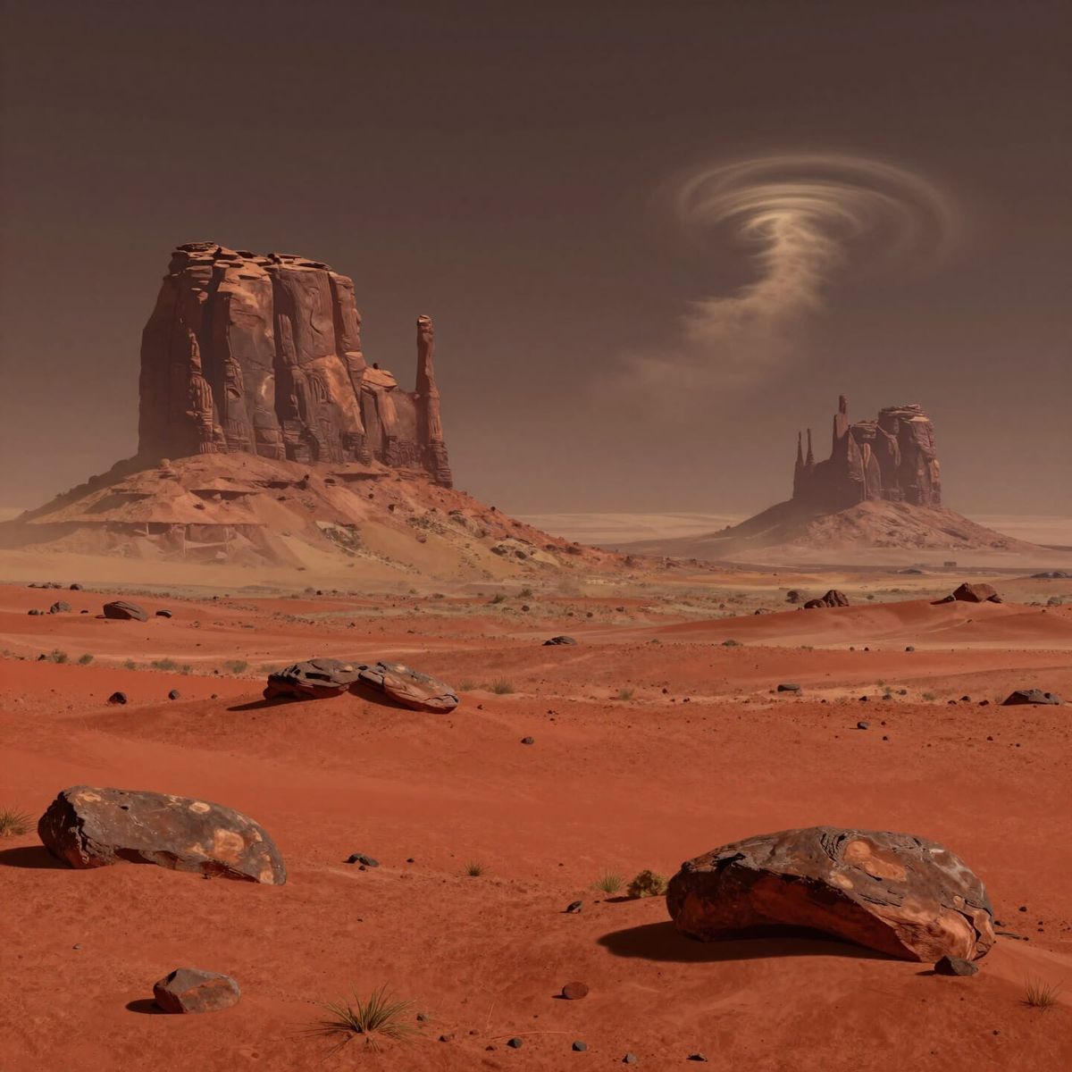 This image depicts a desolate Martian terrain with red dust and ancient rock formations under an alien sky, emphasizing cosmic grandeur in a digital painting style.