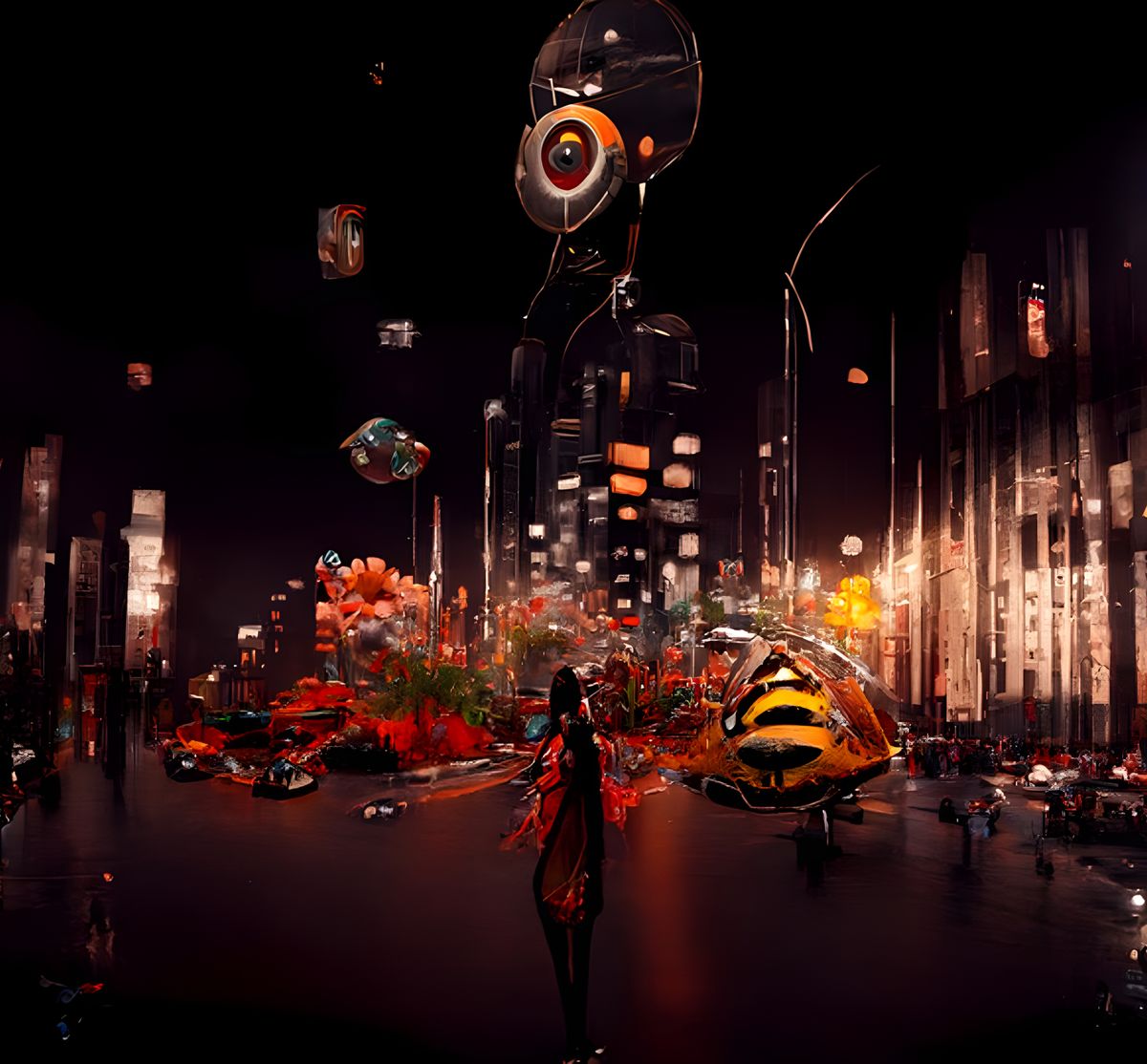A vibrant image of a woman in a futuristic city, surrounded by robotic butterflies. The artwork features a pop art collage aesthetic, with colorful, detailed rendering and volumetric lighting.