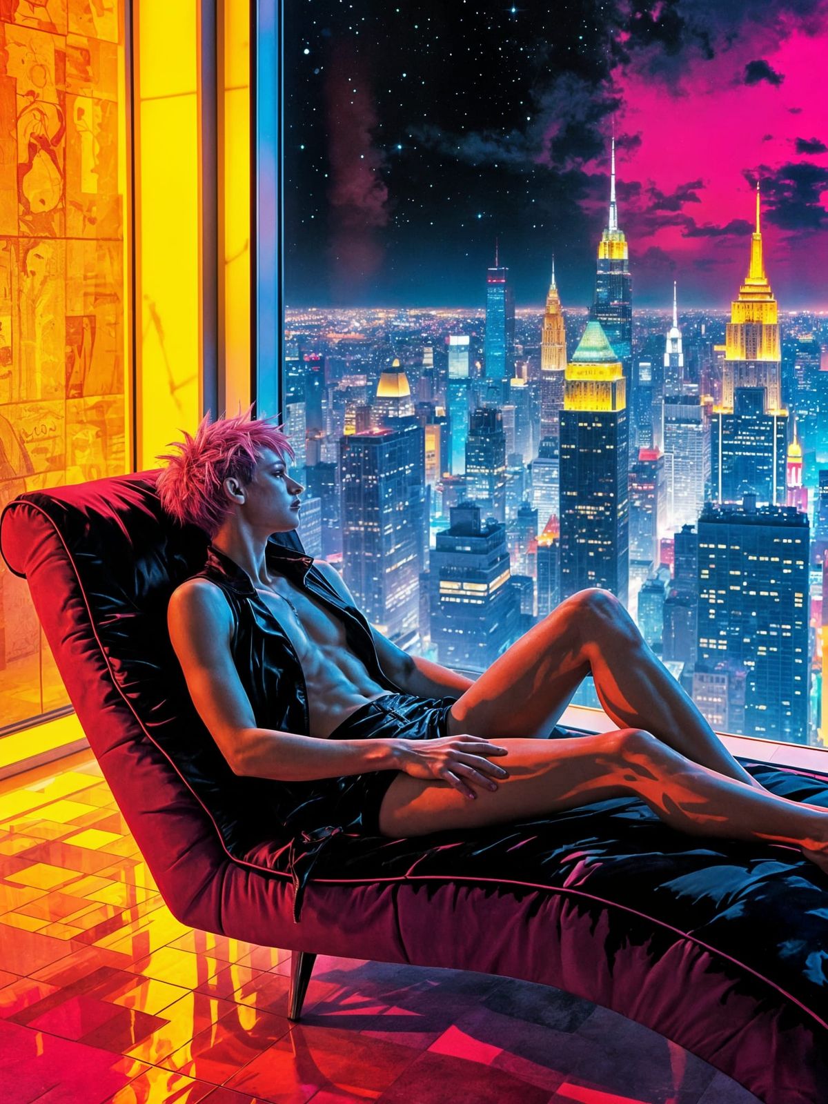 A striking picture of an androgynous person lounging in a futuristic penthouse. The figure has vibrant hair and wears sleek clothing that reflects the neon cityscape. The image is rendered in an impressionist style.