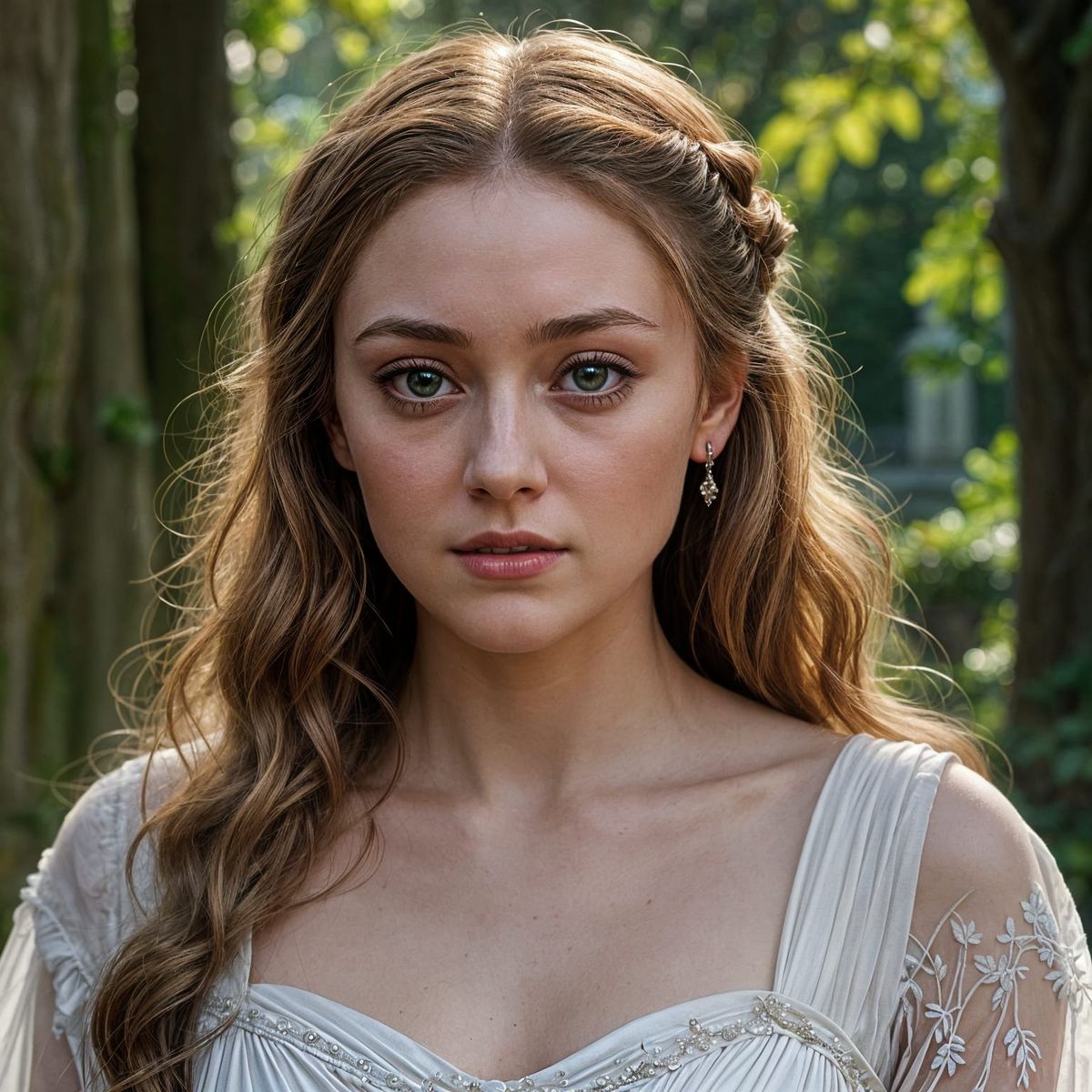 This image depicts a captivating and enchanting young vampire woman, characterized by her striking ethereal beauty and youthful radiance. She wears a luxurious white wedding gown and exudes a sense of otherworldly allure.
