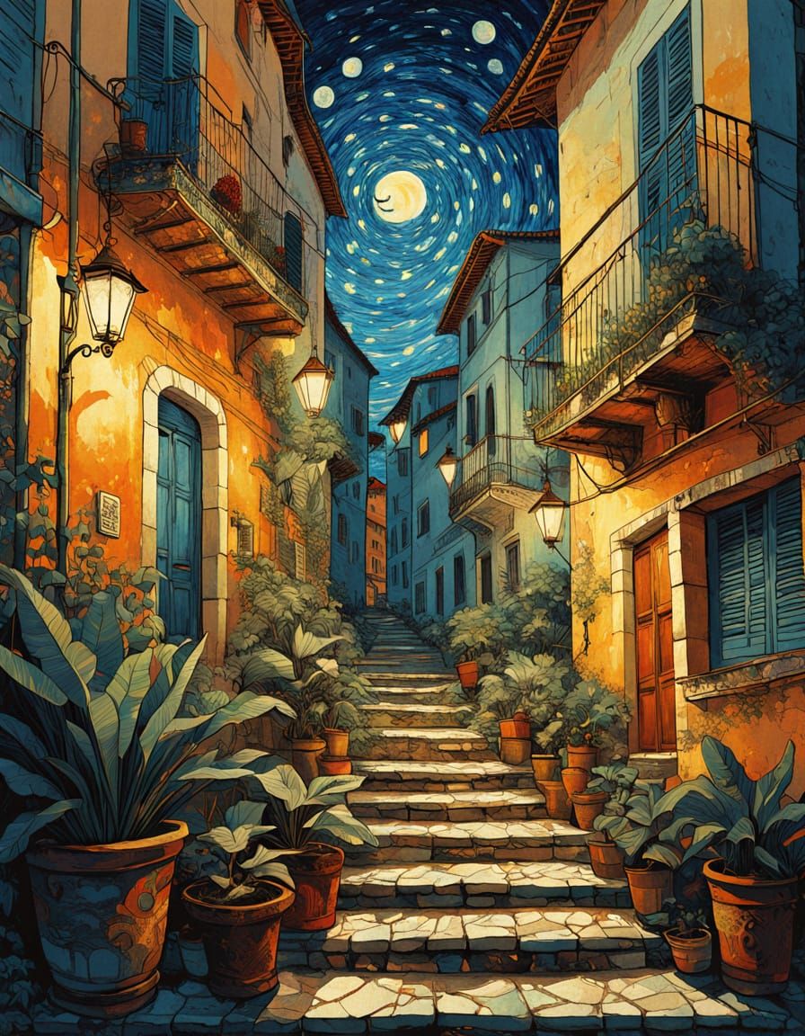 This image showcases a detailed embossed artwork of a romantic pedestrian path in Todi at night, leading towards the sea. It features vibrant doors, plants, lanterns, and a starlit sky, rendered in a hypermaximalist, textured digital art style.