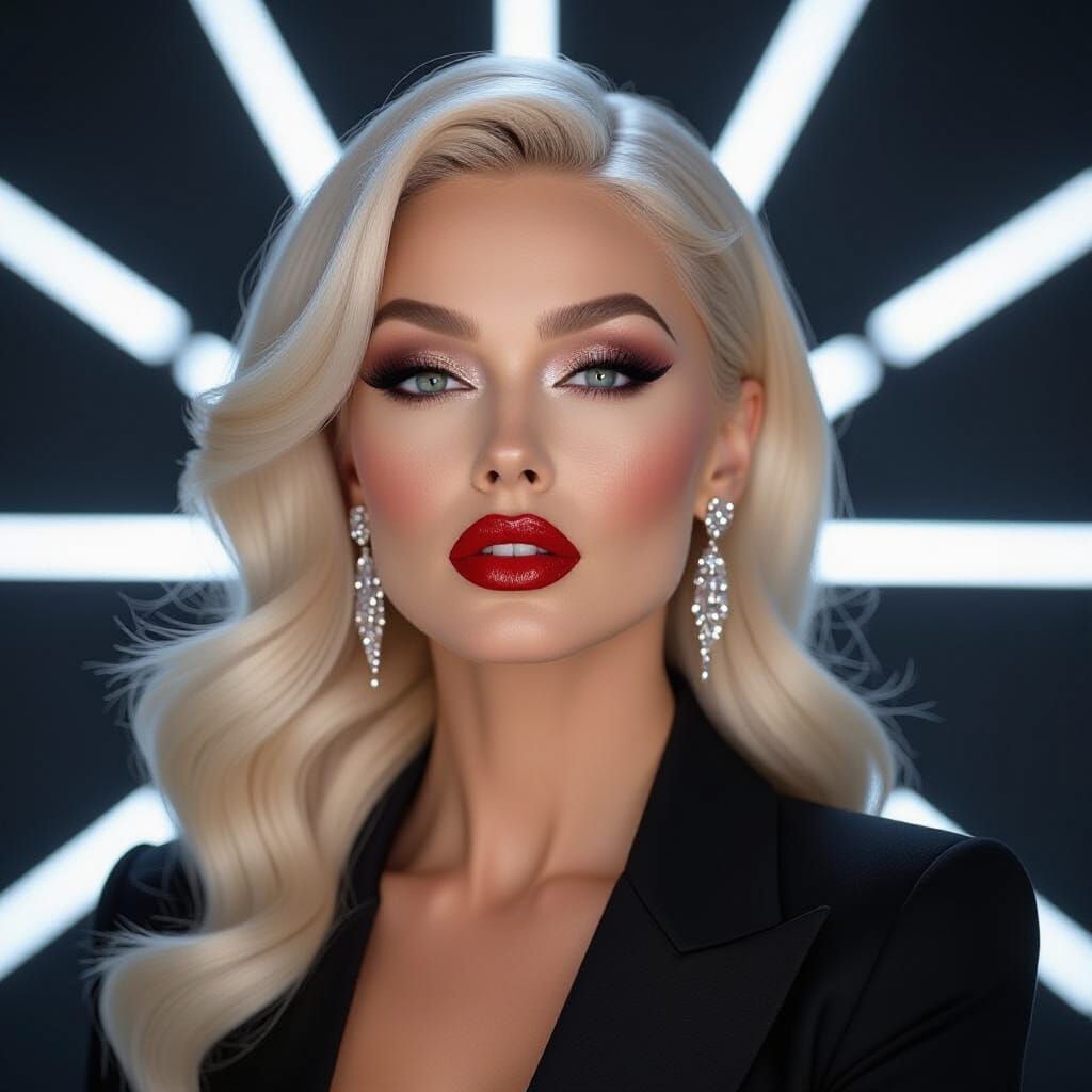 This image shows a confident, striking woman with platinum blonde hair and bold makeup. She wears a glamorous, androgynous style with vivid stage lighting, captured in realistic, high-resolution photography.