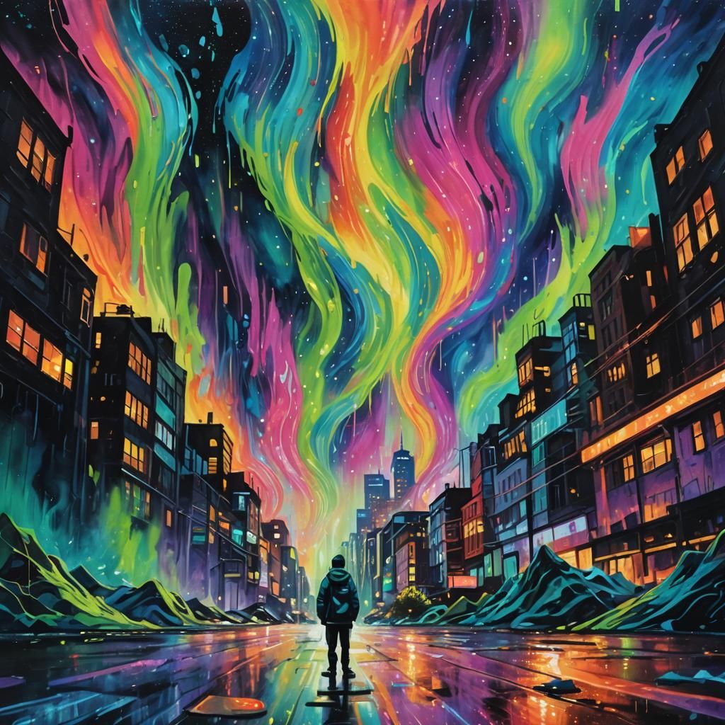 A vibrant street art image of a person looking up at the aurora borealis. The city scene blends neon colors and graffiti effects in a dynamic, atmospheric digital painting.
