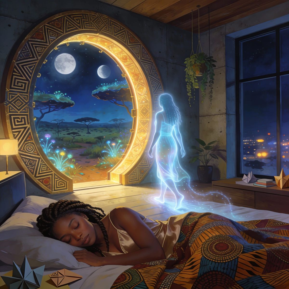 This image shows a woman in a modern bedroom entering a magical portal to a vibrant savannah. The art style blends realism with Afrofuturist elements, featuring bioluminescent plants and celestial bodies.