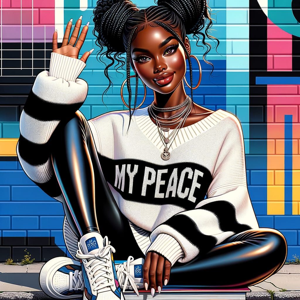 A vibrant digital illustration of a beautiful young Black woman with a braided ponytail, sitting on books in front of a colorful graffiti mural. This pop art image features triadic colors and comic book art elements.