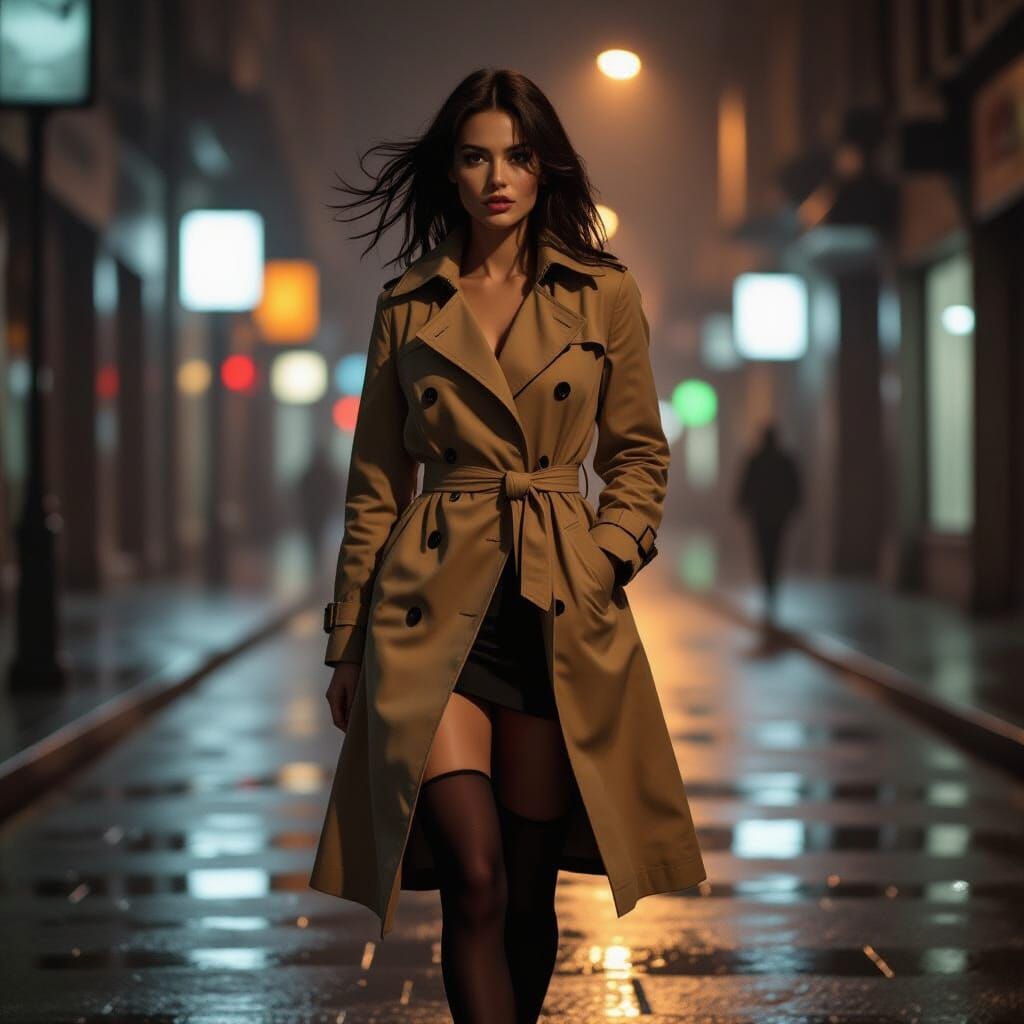 This image shows a woman in a trench coat standing on a wet city street, with one leg exposed. The scene evokes cinematic realism with moody lighting and atmospheric detail.