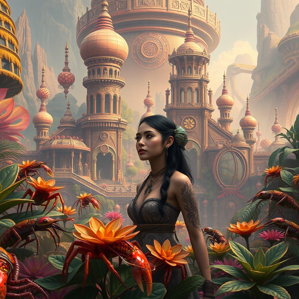 This image shows a woman in a fantastical city overtaken by alien wilderness. Decadent architecture and vibrant flora mix with colorful insectoid aliens in a matte painting style.