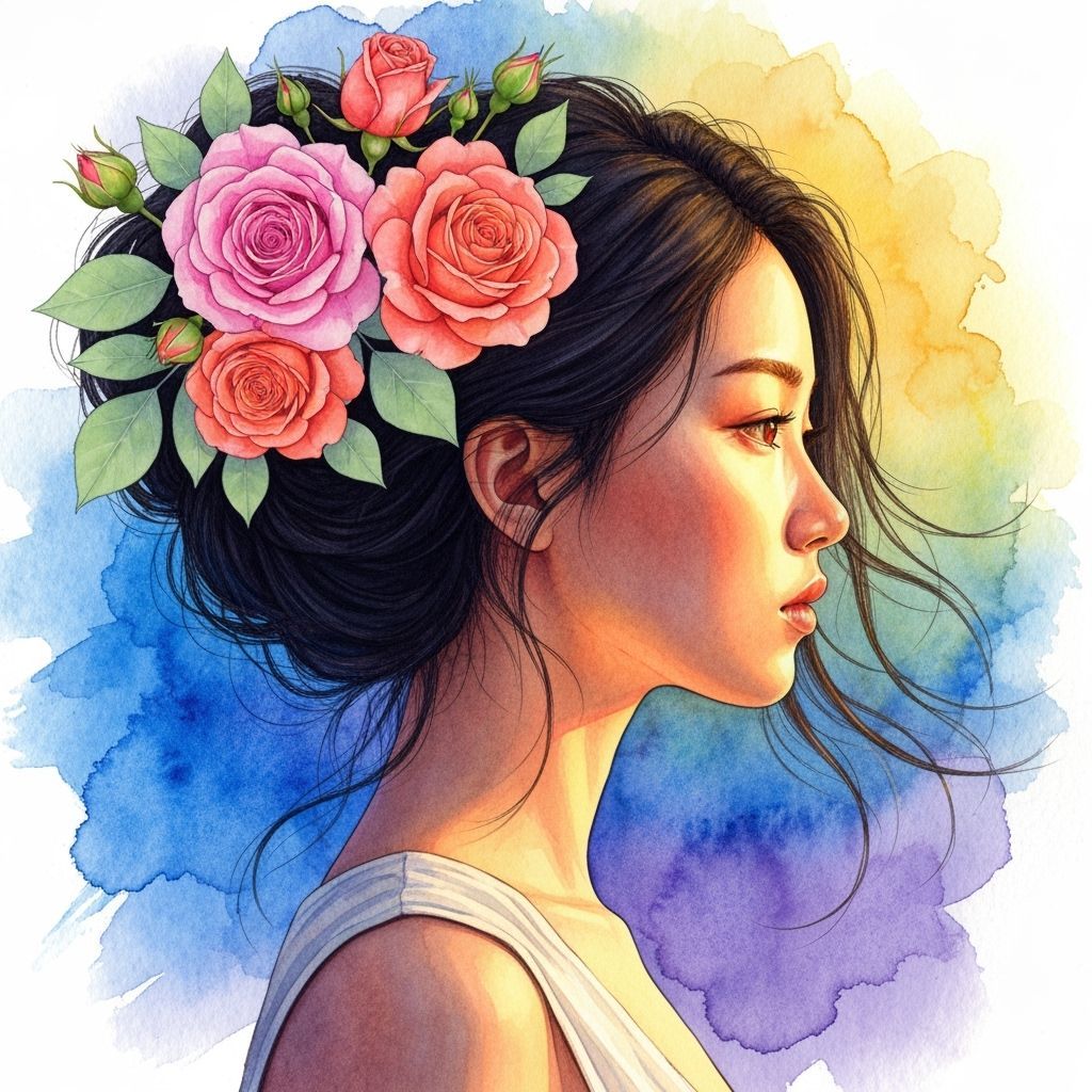 A watercolor portrait of a young woman in profile. Her dark hair is decorated with roses and buds, set against a dreamy watercolor wash background, all illuminated by a warm, golden light.