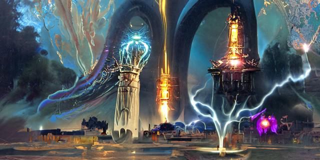A captivating image showcasing an electrifying tower with spiraling electricity and purple lightning. The tower features art nouveau architecture in a surreal, expansive design with luminous plasma, rendered as detailed digital art.