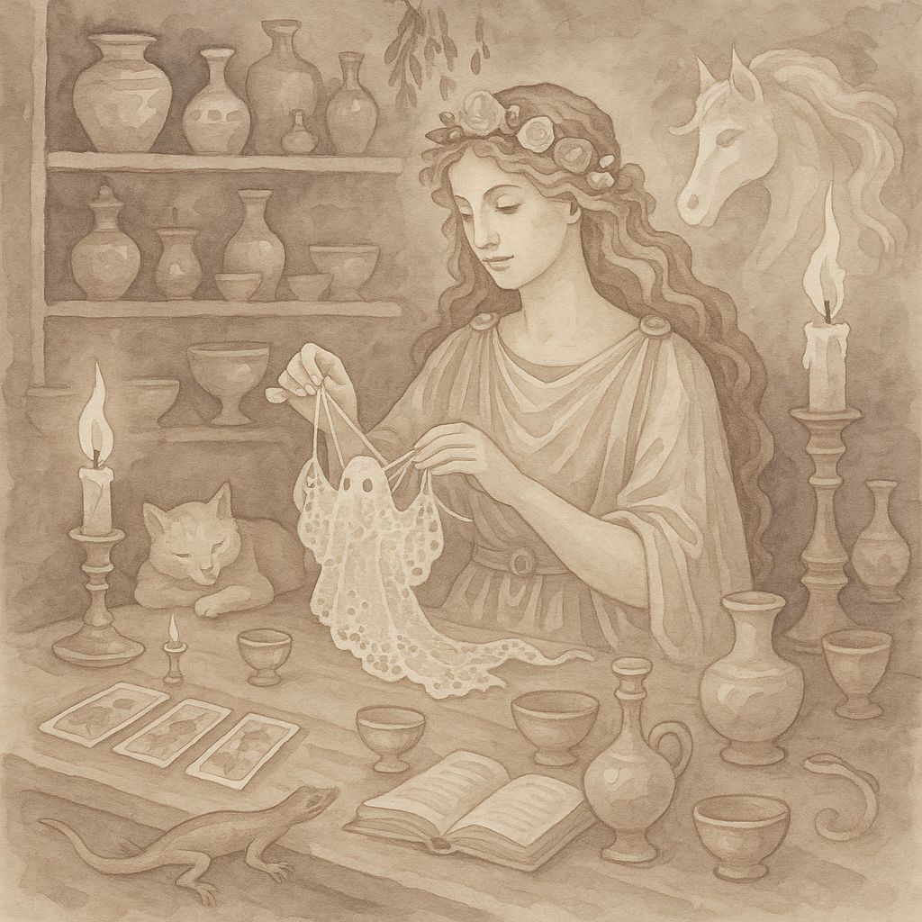 This image shows a monochrome watercolor of the Greek goddess Aphrodite in an ancient apothecary. She wears a toga and weaves lace surrounded by magical objects. The image exhibits a light pastel aesthetic.