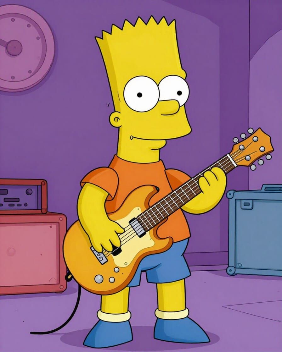 This image depicts Bart Simpson embodying the persona of a famous rockstar, complete with stage presence and iconic style.
