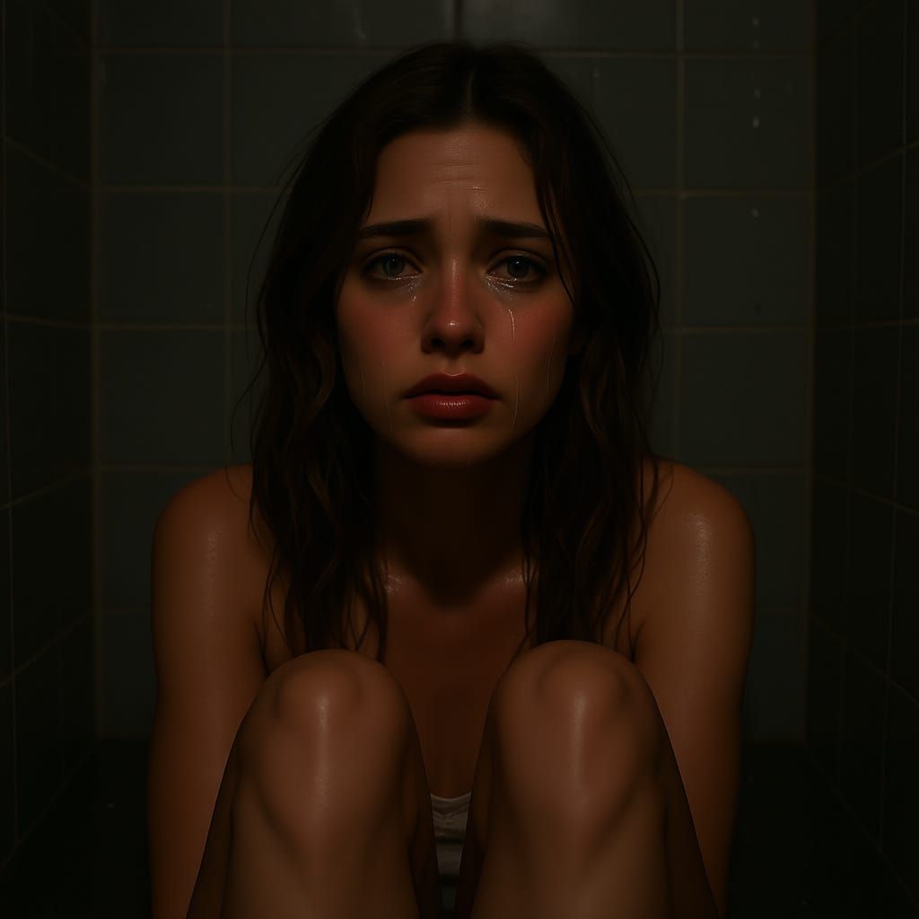 This image depicts a young woman with light brown hair and green eyes, sitting in a shower and crying. Her head is leaned back against the wall as she holds her legs.