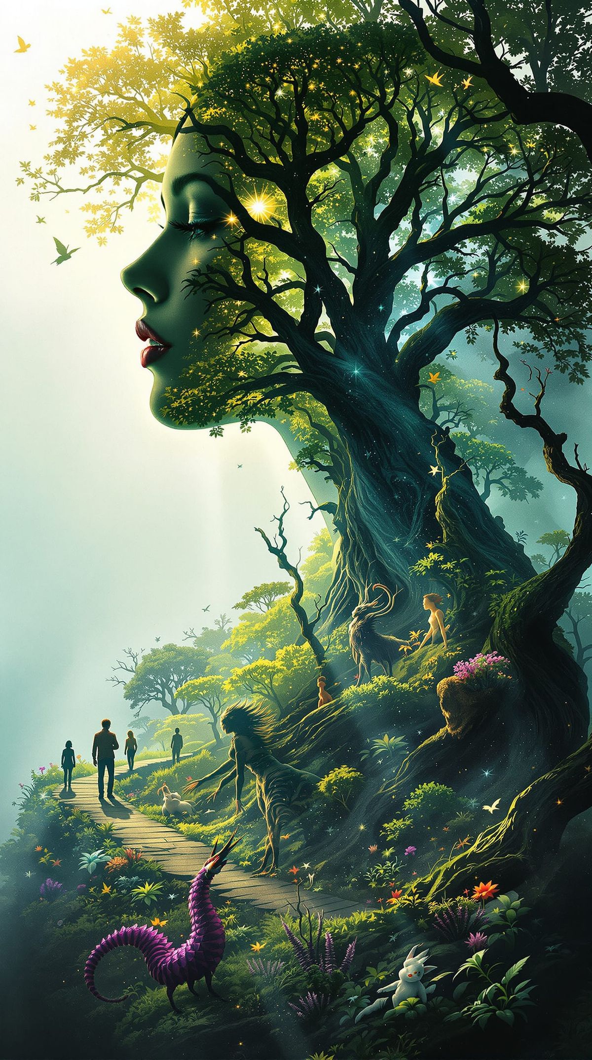 This image features a double exposure silhouette of a woman merging with an enchanted forest, filled with magical creatures and ancient trees. Sunlight creates dramatic light shafts in this detailed fantasy illustration.