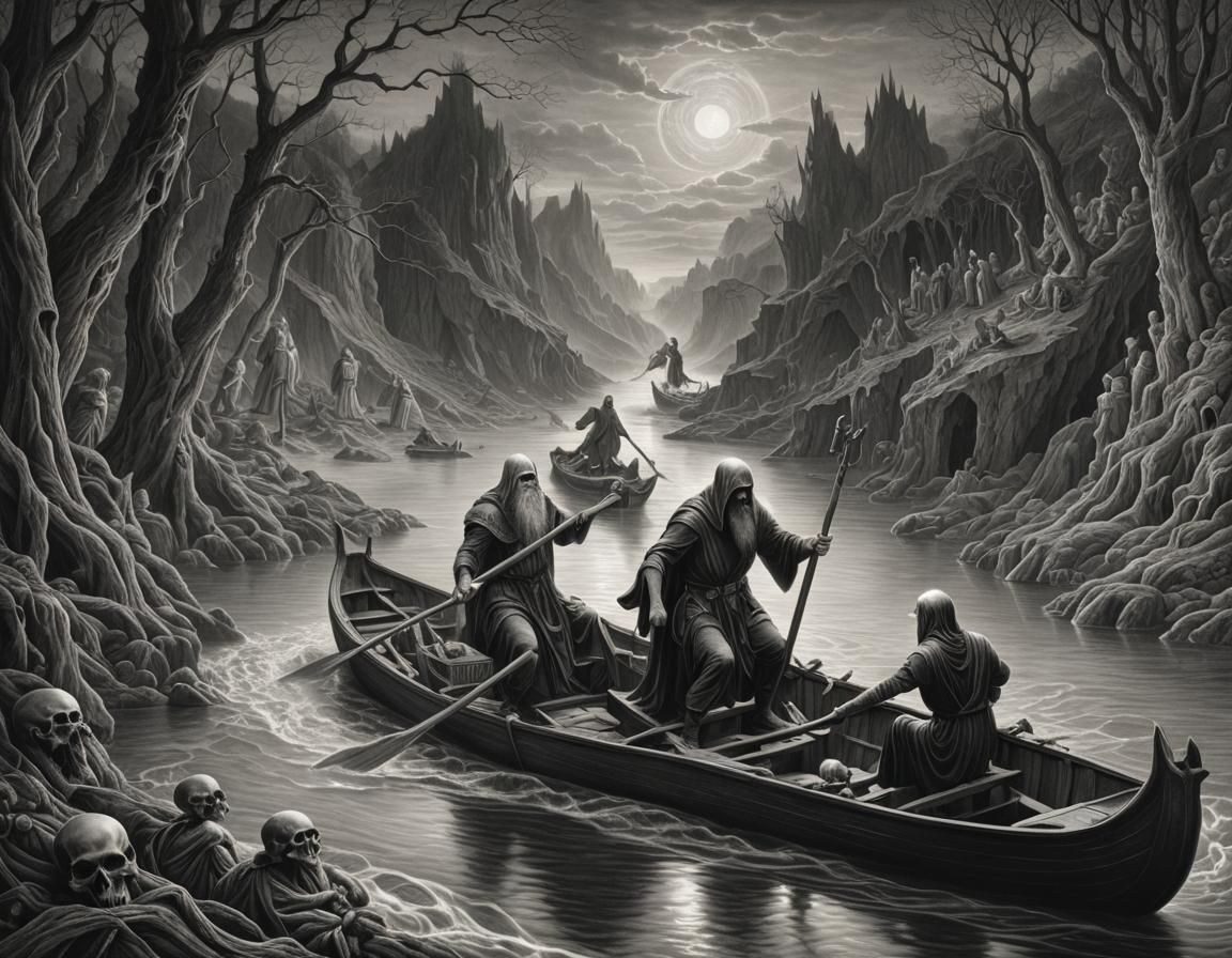 A detailed graphite pencil drawing of the River Styx. The image depicts Charon, the ferryman, transporting souls of the dead to the realm of Hades.