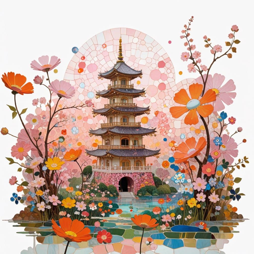 This image features a delicate watercolor pagoda surrounded by pastel pink blossoms and a warm orange sun gradient. Soft reflections appear on calm water, set against a mosaic background.