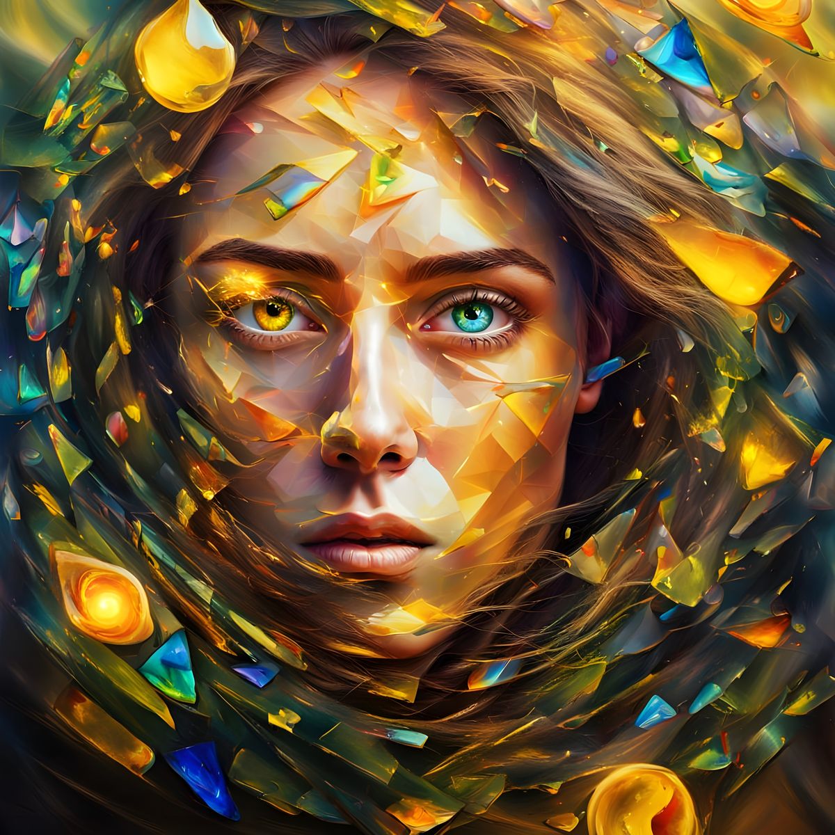 A portrait of a beautiful woman with yellow eyes, surrounded by a swirling vortex of colored glass