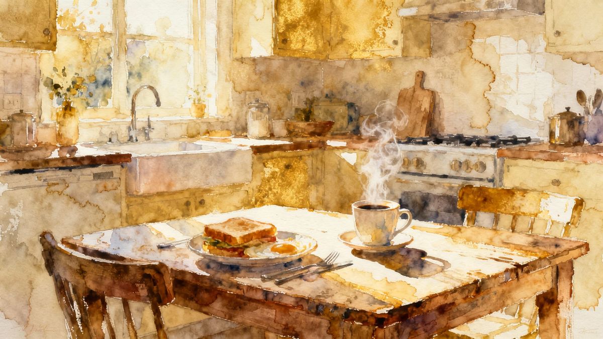 This image shows a peaceful kitchen scene at dawn. Sunlight illuminates a breakfast setting on a wooden table, with steam from a coffee cup. Created as a textured oil painting with alcohol ink details.