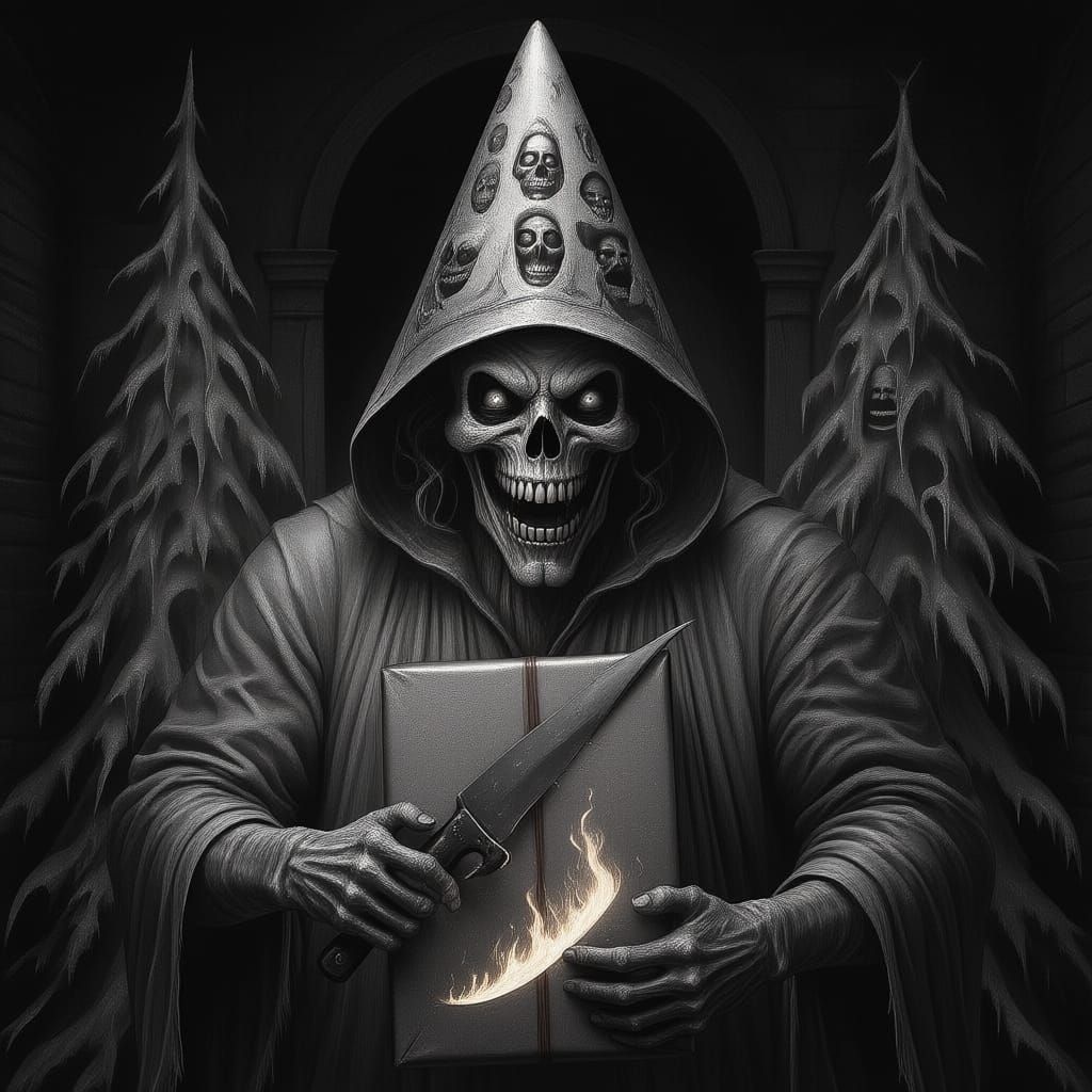 This image shows a monstrous, three-eyed Santa fused with Krampus, with a cone-shaped head of faces. It depicts him burning a Christmas tree and gifts, smiling sinisterly, in a hyperrealistic, photographic style.