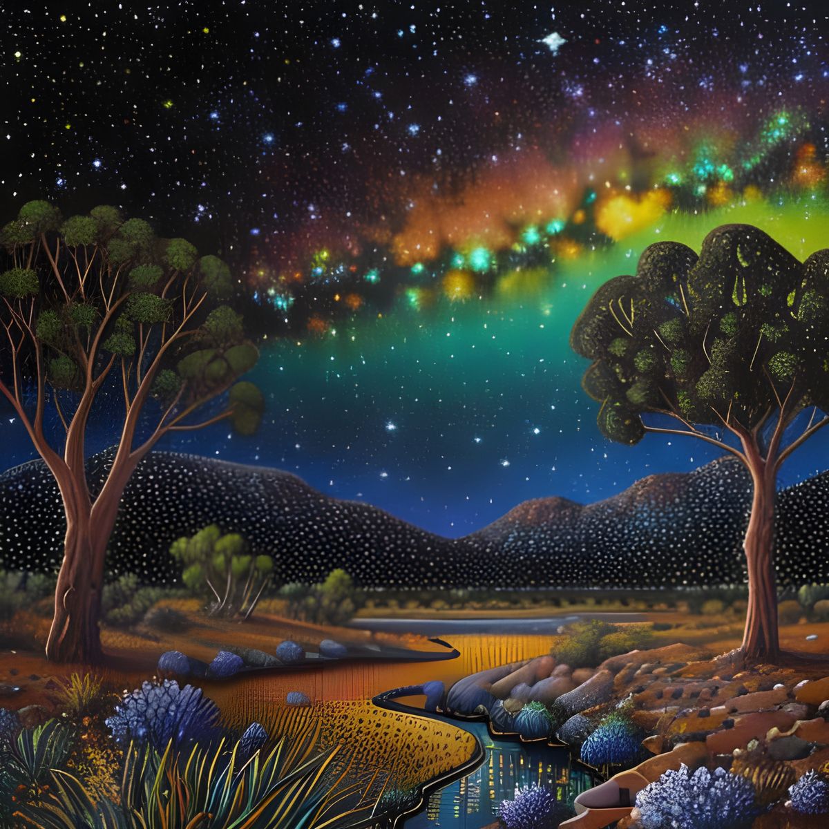 A vibrant pointillist painting of an Australian desert landscape under a starry sky. The artwork uses thick, textured acrylic paint to create a mosaic of distinct dots, each shimmering with detail.