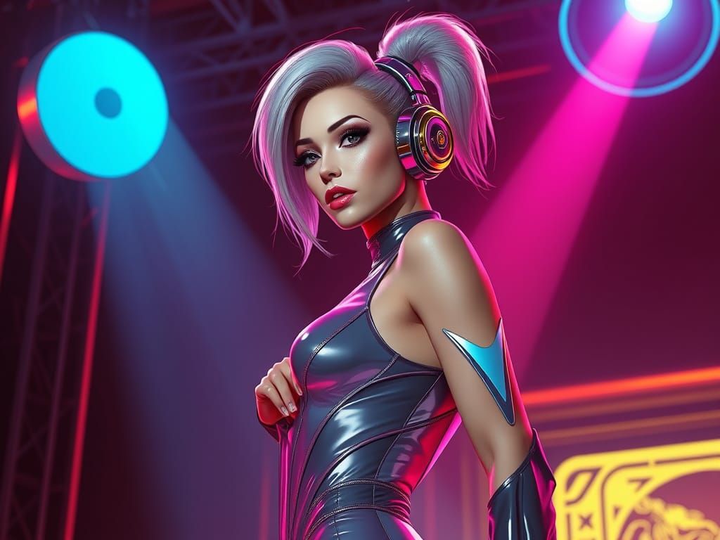 A captivating image of a futuristic showgirl illuminated by stage lights. The scene evokes a neon-lit science fiction world with vibrant digital art and elegant futuristic design.