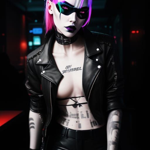 This image shows a female goth with chrome skin in a cyberpunk aesthetic. The digital art features neon lights and glowing red lines. The scene is set in a goth coffee shop with a smoky atmosphere and dramatic lighting.