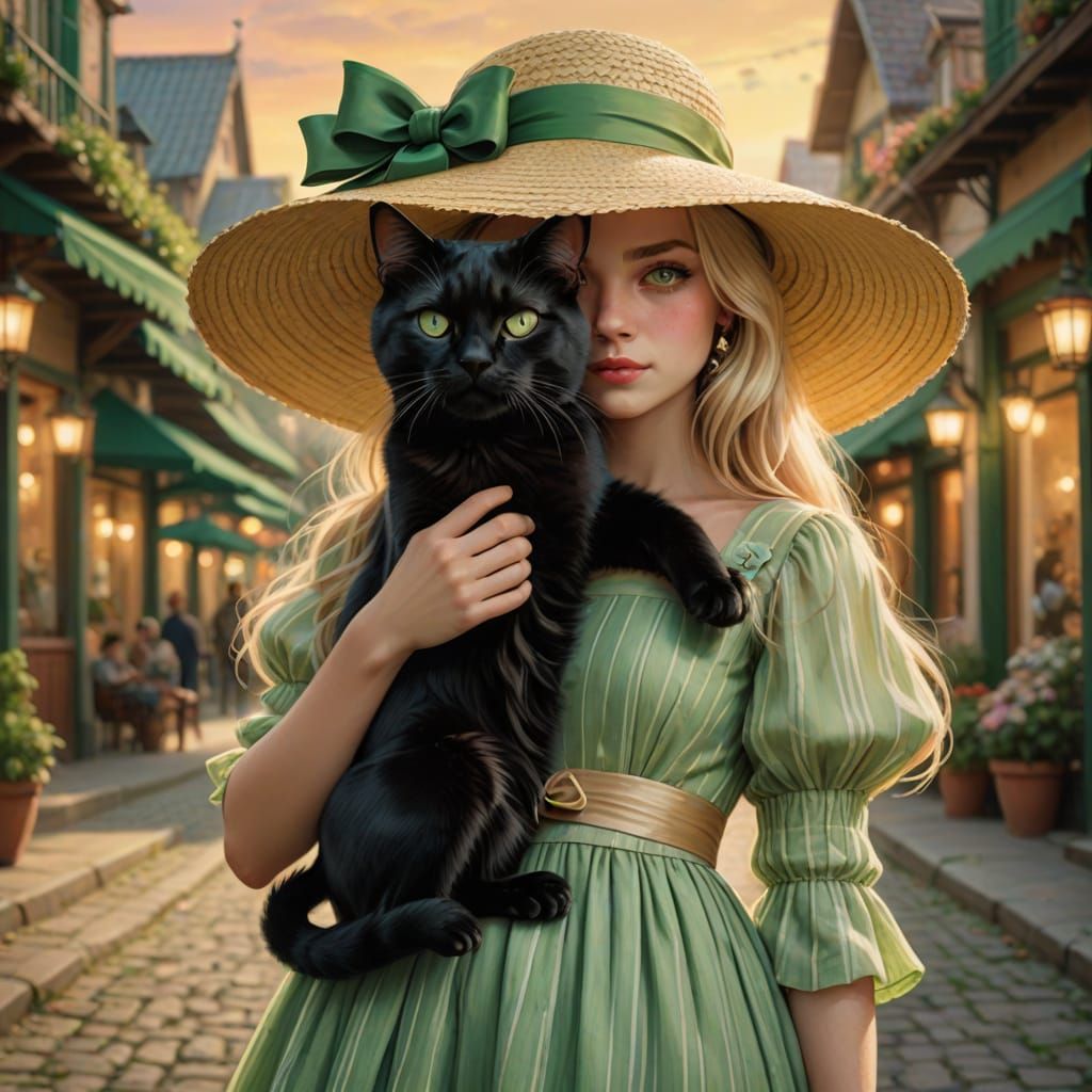 This digital matte painting captures a serene moment featuring a young girl in a striped dress and colorful hat with a fluffy black cat. Soft lighting and a pastel palette create a whimsical atmosphere.