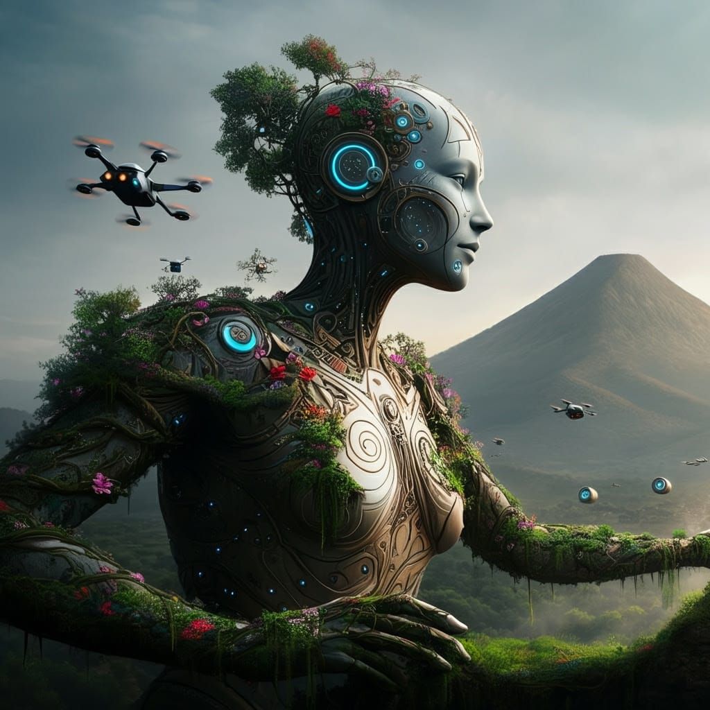 This image depicts a wise, athletic humanoid robot in ornate metallic armor, surrounded by lush vines and flowers, restoring the rainforest near ancient Teotihuacan with the help of drones, set against a majestic mountainous backdrop at dusk, in a hyperrealistic, cinematic science fiction style.