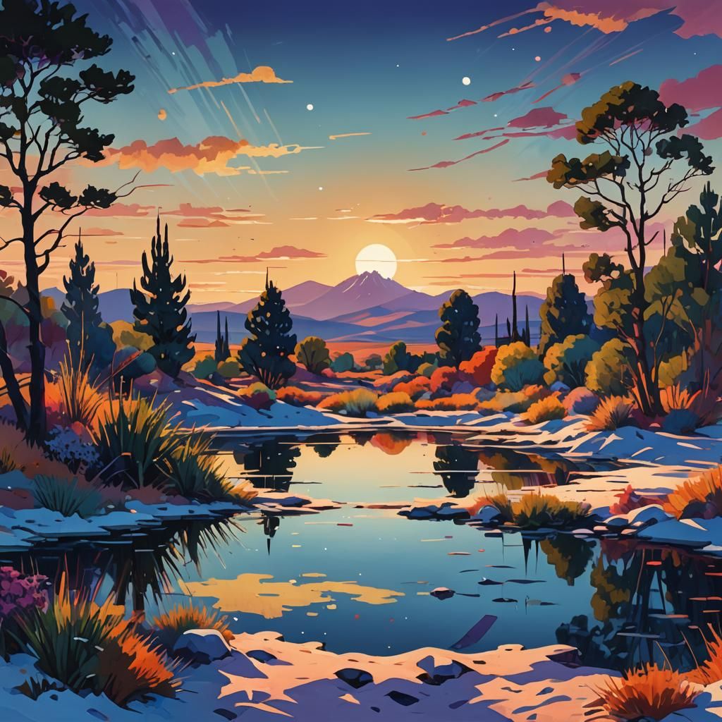 A vibrant digital painting of a desert oasis with a blue pond at sunset. The image uses warm and cool colors to create a serene, fantasy landscape with intricate details in an abstract expressionism style.