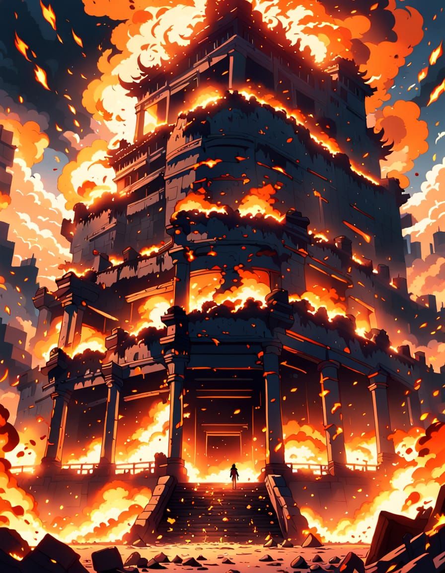 A dynamic close-up of a giant inferno consuming flames, with swirling embers and fiery explosions. This vibrant anime-style digital art features detailed smoldering ruins and warm golden lighting.