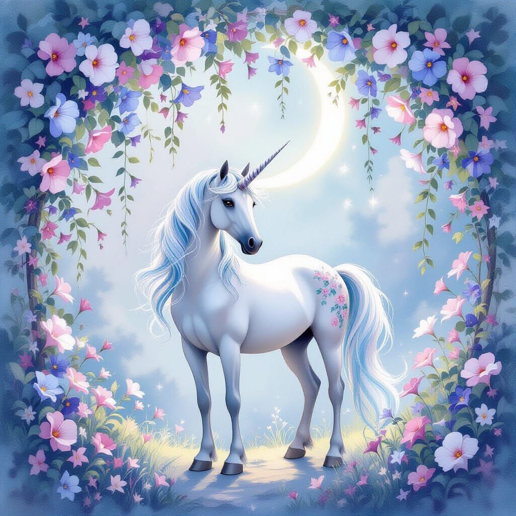 This spit-bite aquatint illustration shows a white unicorn with a blue mane adorned with pastel flowers under a morning glory arch. A crescent moon illuminates the magical, pastel scene.