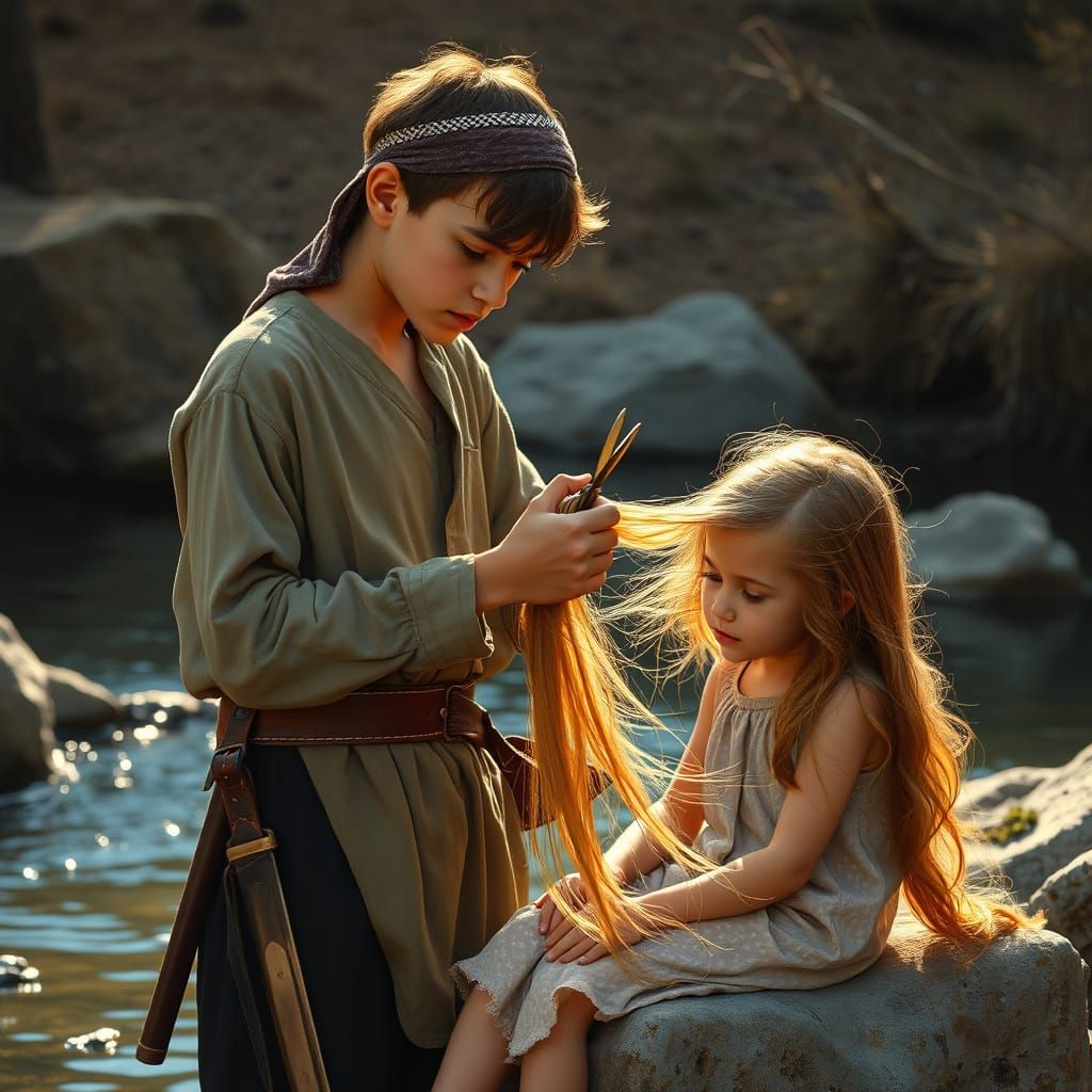 This image shows a 16-year-old Hebrew boy cutting the hair of a young girl by a serene stream, surrounded by warm, golden light and earthy tones reminiscent of the Old Masters.