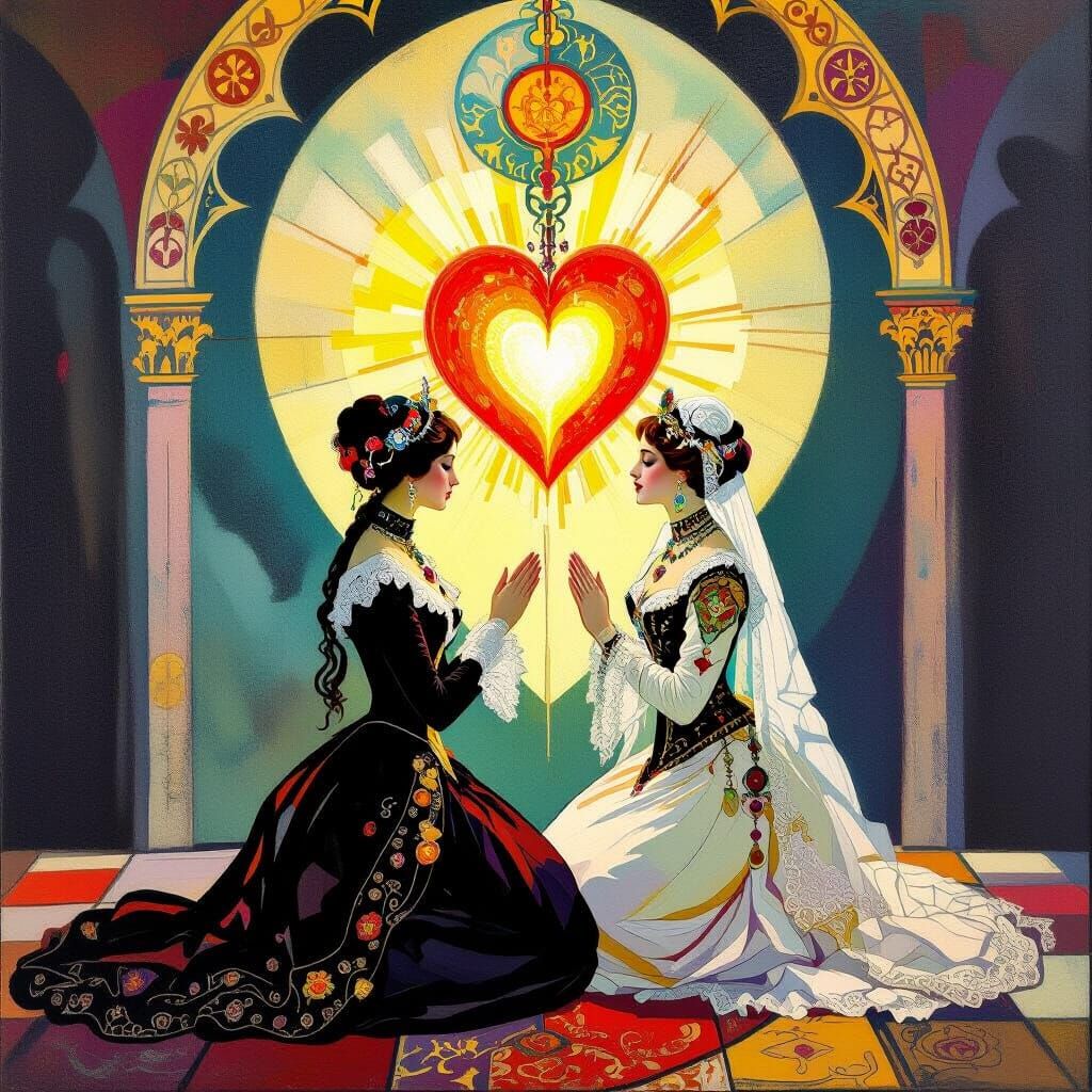 A vibrant image of a woman in Victorian dress kneeling before a glowing sacred heart, framed by Gothic arches and mystic symbols. The artwork uses bold brushstrokes and geometric shapes.