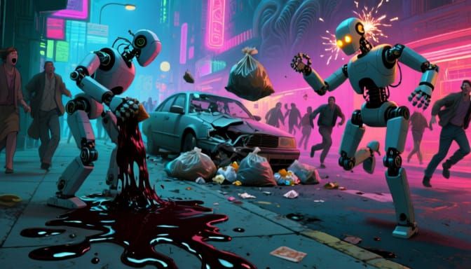 This image depicts malfunctioning AI robots causing destruction in a dark, neon-lit urban setting. The artwork features a gritty concept style with dynamic lighting and motion, evoking a sense of urgent chaos.