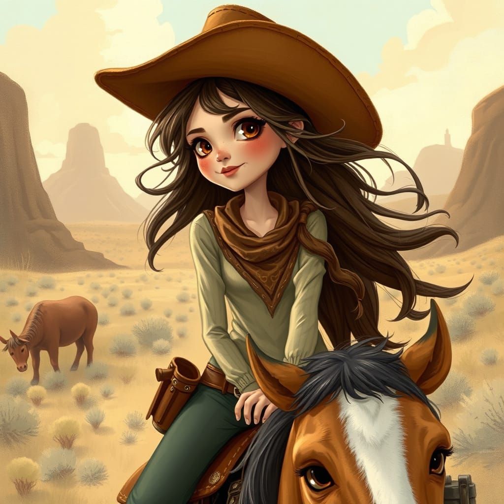 This image shows a Disney-style cowgirl riding a horse in a Wild West setting. The artwork features intricate details and textures with a whimsical and romanticized aesthetic.
