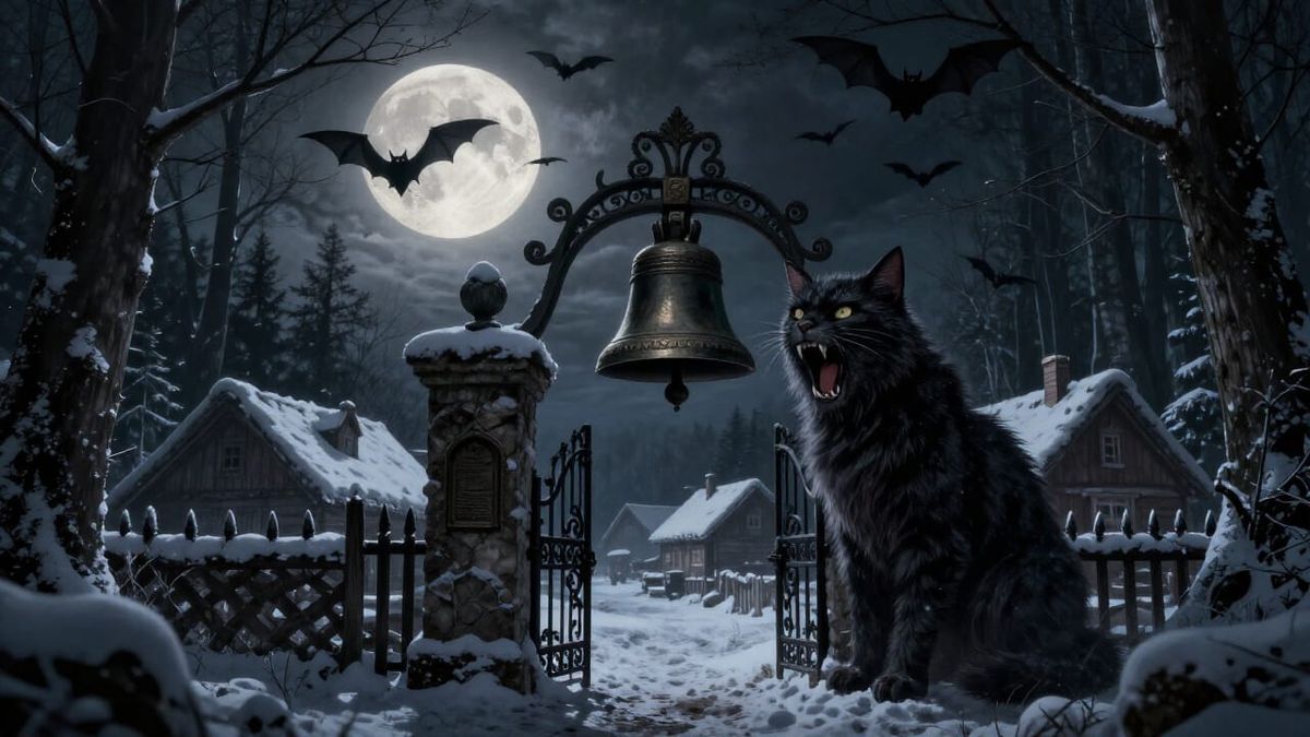A super full moon illuminates a secluded snowy village and its gates, where a hungry Yule Cat with an ornate bell awaits. Bats fly in the atmospheric, dark fantasy art style.