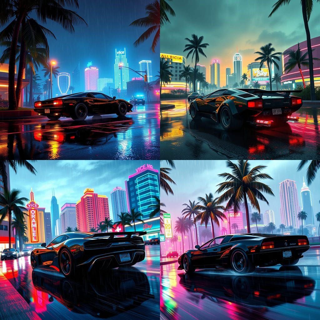 This image showcases a hyperrealistic, neon-lit street scene reminiscent of Vice City. A sports car drifts amidst swaying palm trees, with the distinctive skyline glowing in the background.