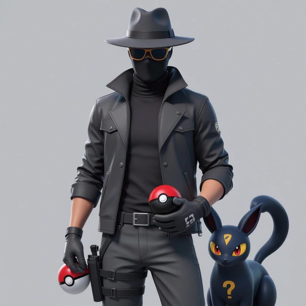 A mysterious masked trainer stands with an Umbreon, incognito in a dark grey jacket and fedora. This detailed matte painting uses fantastical colors and dramatic contrast for a splash screen aesthetic.