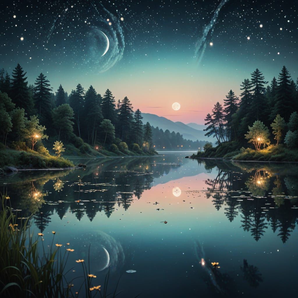 A surreal close-up of a moonlit lake reflecting the night sky. Fireflies glow near the shimmering water in soft pastel colors, creating a mesmerizing and peaceful scene.