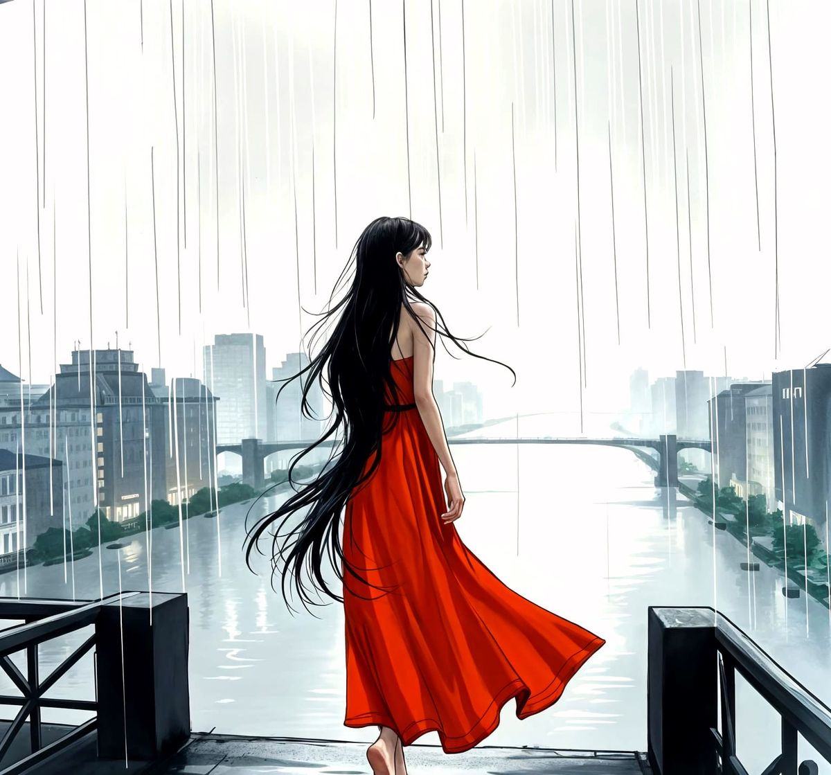 A captivating image of a woman on a bridge in the rain, city lights reflecting in the river below. The scene is reminiscent of ink and watercolor art, with soft brush strokes and an ethereal mood.