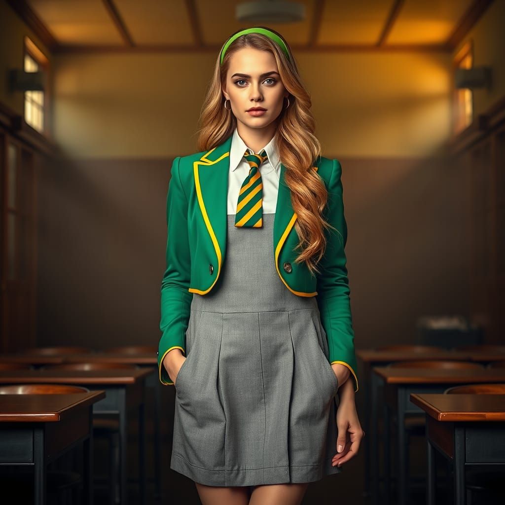 This image shows a poised woman in a dimly lit classroom, surrounded by rich wood accents and warm golden lighting, wearing a bespoke emerald green blazer and intricate details, evoking a sense of nostalgia and timelessness in a maximalist style