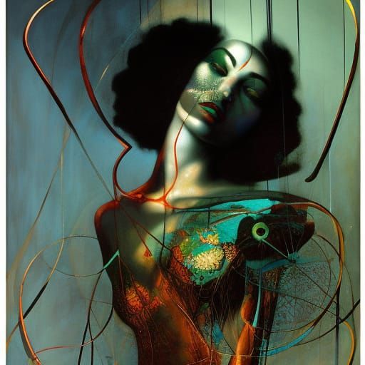 This image shows a digital artwork featuring girls in shades of blue, green, purple, and white against a dark background. It incorporates paper-mache, circuitry, and geometric patterns.