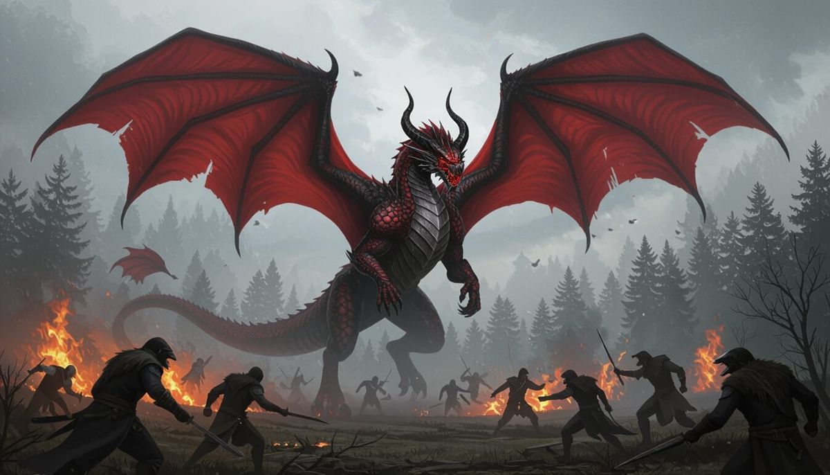 This image shows a striking dragon with red and black scales fighting werewolves amidst a burning forest. The scene depicts a fierce battle in a smokey, war-torn landscape, rendered with dramatic intensity.