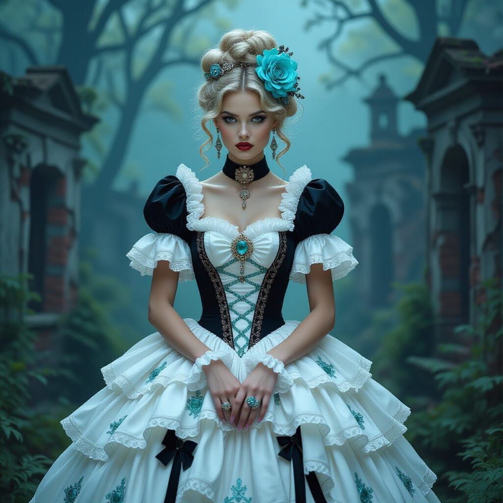 This image shows a goth duchess in an elaborate ruffled gown and intricate hairpieces, set against a mystical forest with ruins. Features dark romanticism style with dramatic lighting.