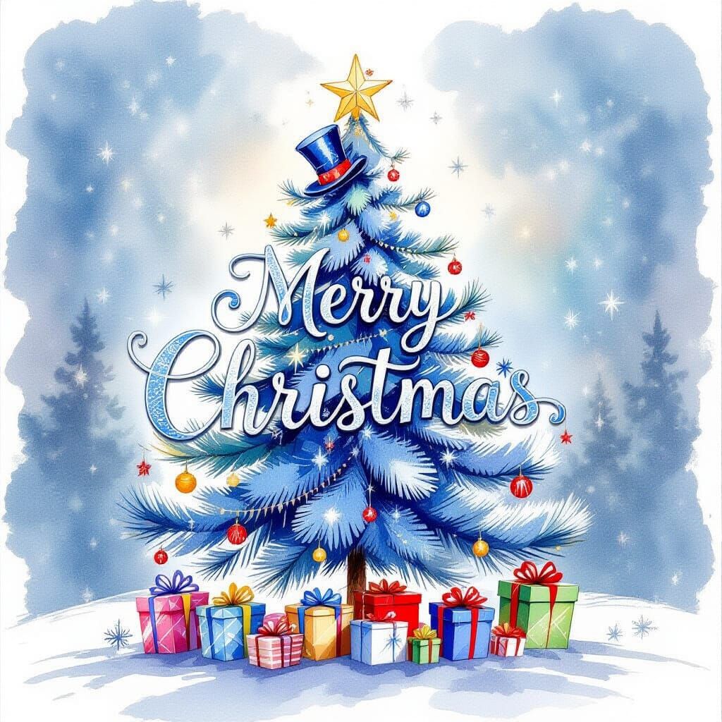 A refined blue-ink and watercolor illustration displays "Merry Christmas" with a central tree adorned in top hats. Cool blue washes create a formal, warm atmosphere.