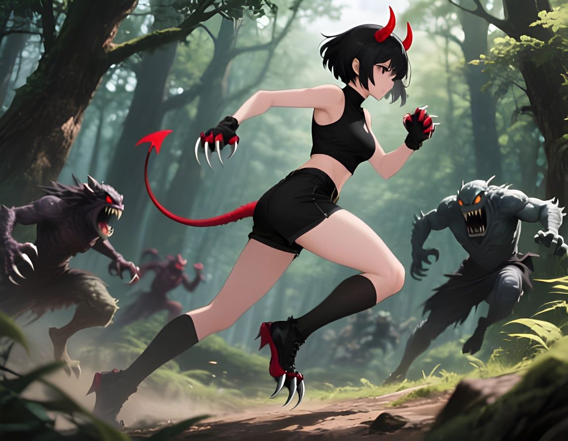 This image shows a determined anime woman with devil horns and a tail, facing off against approaching monsters in a highly detailed forest. Captured in a sideview, it features intricate details and HDR quality.