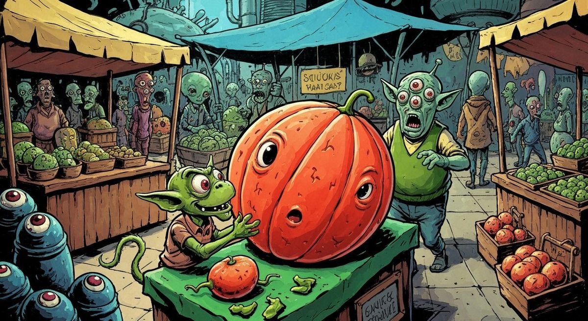 A humorous scene at an alien market shows a gremlin-like alien trying to steal a giant space-melon from a multi-eyed vendor. The chaotic market is rendered with a bold, expressionistic style.