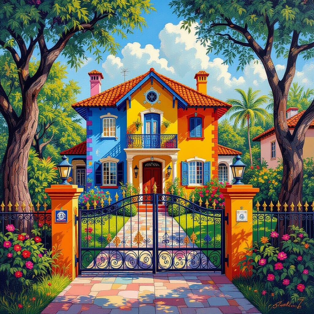 A vibrant house is surrounded by a beautiful fence, gate, and trees. This striking oil painting blends realism and fantasy with intricate details, in an astral cosmic style.