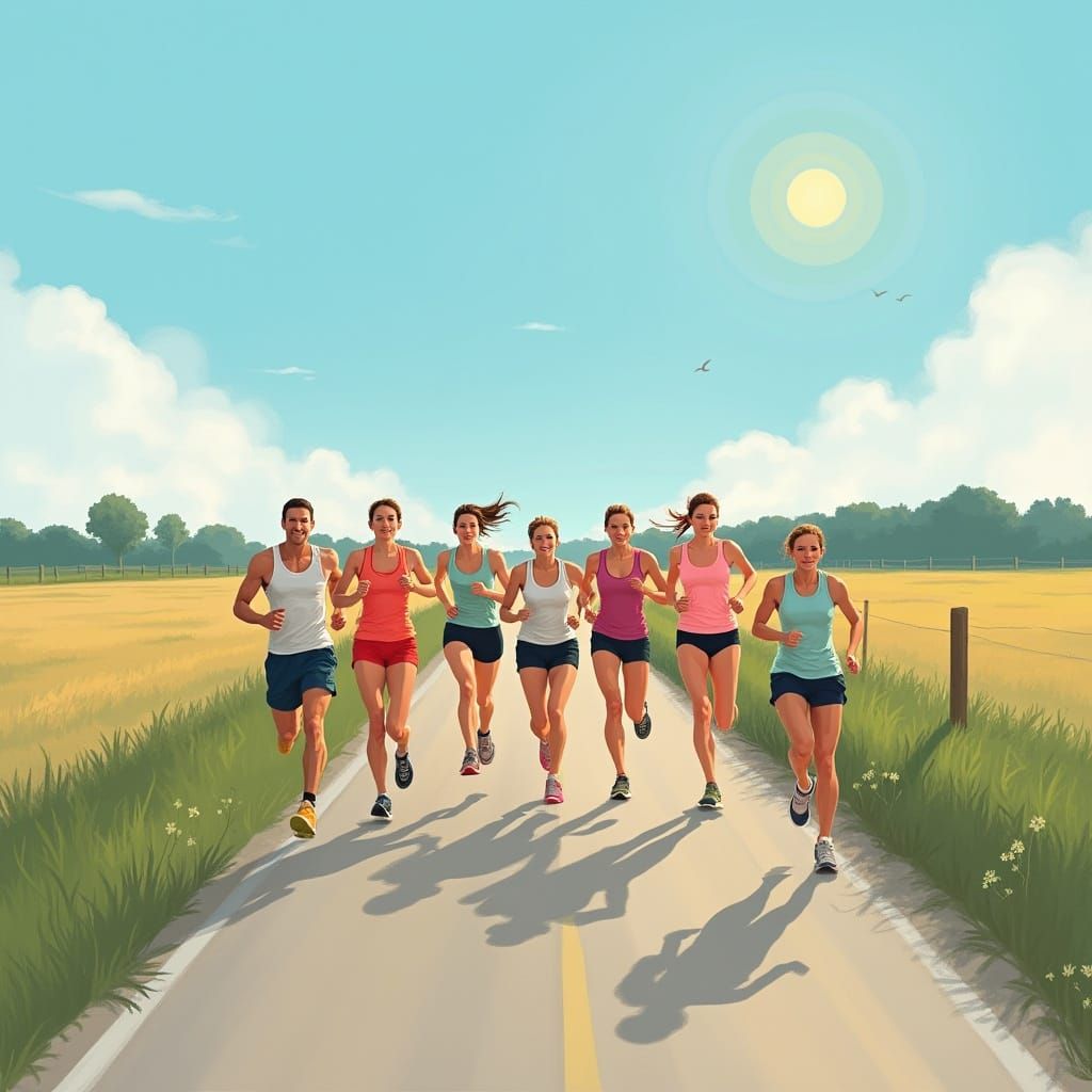 This image captures a lively group of runners, both men and women, of various ages, as they jog along a worn-out track surrounded by trees and a vast open field. The bright blue sky and warm sunlight add to the joyful atmosphere, showcasing the runners' energetic and carefree spirit.