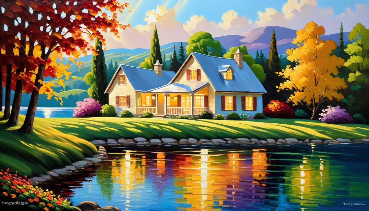 This image shows a quaint storybook cottage beside a tranquil lake, painted with vibrant colors and thick, textured impasto brushstrokes. Golden hour light creates a deeply serene atmosphere.