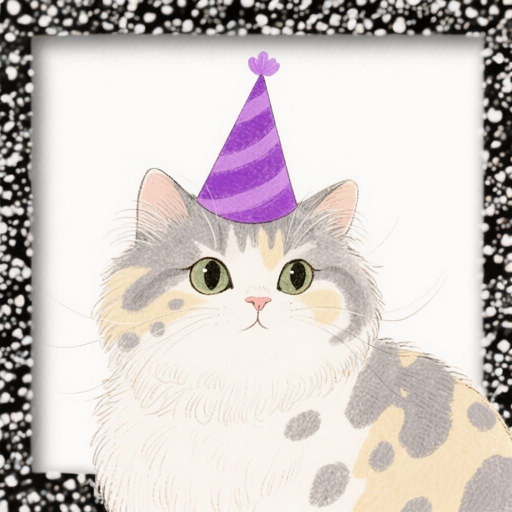 A charming Persian cat with grey and cream spots wears a purple birthday hat. This image evokes the whimsical, delicate style of classic children's book illustrations.